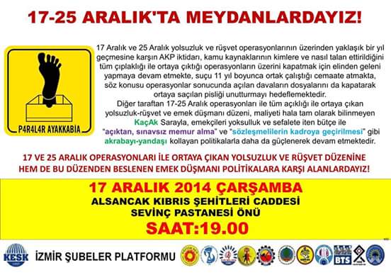 Bu nedenle konfederasyonumuz hem 17 Aralık ve 25 Aralık operasyonları ile ortaya çıkan yolsuzluk ve rüşvet düzenine hem de bu düzenden beslenen emek düşmanı politikalara dikkat çekmek için 17 ve 25 Aralık Aralık tarihlerinde basın açıklmaları, yürüyüşler ve çeşitli eylem-etkinlikleri hayata geçirecektir.