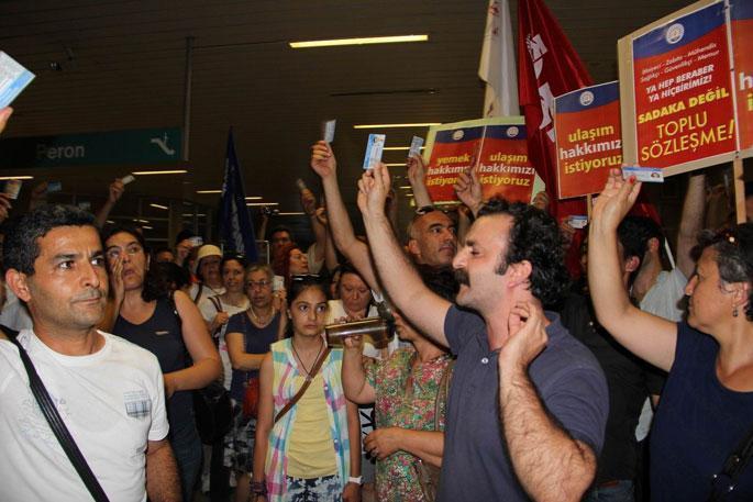 Belediye hizmet binasına personel ve başkanlık makamı kapısından girişine izin verilmeyen grup, eylemlerini İzmir Metrosu Konak İstasyonu'nda sürdürdü. "Sadaka değil toplu sözleşme" ve "Bu daha başlangıç mücadeleye devam" şeklinde slogan atan eylemci memurlar, belediye personeli kartını göstererek istasyona girmek istedi. Güvenliğin buna izin verememesi üzerine gruptakiler, turnikelerin üzerinden atlayarak ve acil geçiş kapısını kullanarak istasyona girdi.