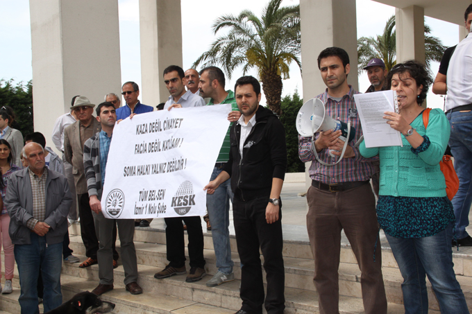TÜM BEL-SEN İzmir 1 No’lu Şube adına basın açıklaması yapan Başak Mamat, “Bugün yine kapkara bir güne, ülkemiz tarihinin en büyük ve kitlesel katliamlarından birine uyandık. Manisa Soma’daki, Soma Holding’e ait kömür madeninde trafo patlaması sebebiyle gerçekleştiği iddia edilen yangın sonrası yüzlerce maden işçisinin iki bin metre derinlikte mahsur kalmasına ve ne yazık ki pek çoğunun yaşamını yitirmesine tanıklık ettik. Daha önce olduğu gibi şimdi de bu dehşetengiz bilançonun üstü örtülmek isteniyor. AKP emeklerimizi çalıyor, çalışma yaşamını güvensizleştiriyor, işçi sağlığı ve iş güvenliğini yok sayıyor, iş cinayetlerine yol açıyor” dedi.