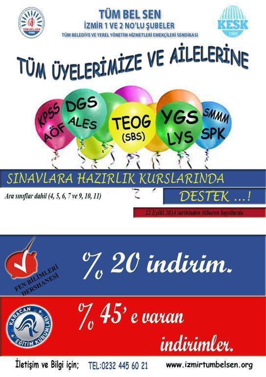 Sendikamız TÜM BEL-SEN İzmir Şubeleri tarafından, üyelerimize ve ailelerine katkı olması amacıyla, sınavlara hazırlık kurslarında indirim yapılmasına yönelik olarak Fen Bilimleri Dershanesi ve Karacan Dershanesi ile anlaşılmıştır. Buna göre Fen Bilimleri Dershanesi sınavlara hazırlık kurslarında %20, Karacan Dershanesi sınavlara hazırlık kurslarında %45'a varan indirim uygulayacaktır. Üyelerimiz, kayıt başvurusunda gerekebilecek Sendikamız Üyesi olduklarına ilişkin belgeyi, Şubemizden temin edebilirler.