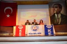 Konuşma yapan DİSK Ege Bölge Temsilcisi ve Genel-İş 3. No’lu şube başkanı Memiş Sarı, Genel-İş ve Tüm-Bel-Sen olarak yerel yönetimlerde aynı işyerlerinin farklı kısımlarında örgütlendiklerini, mücadeleyi buralardan birleştirerek beraber ileriye taşımaları gerektiğini söyledi.