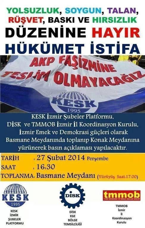 YOLSUZLUK, SOYGUN, TALAN, RÜŞVET, BASKI VE HIRSIZLIK DÜZENİNE HAYIR DEMEK İÇİN KESK, DİSK, TMMOB'UN ÇAĞRISIYLA 27 ŞUBAT PERŞEMBE GÜNÜ SAAT 16.30'DA BASMANE MEYDANINDA TOPLANARAK KONAK MEYDANINA YÜRÜYÜŞ DÜZENLENECEK VE KONAK MEYDANINDA BASIN AÇIKLAMASI YAPILACAKTIR.
