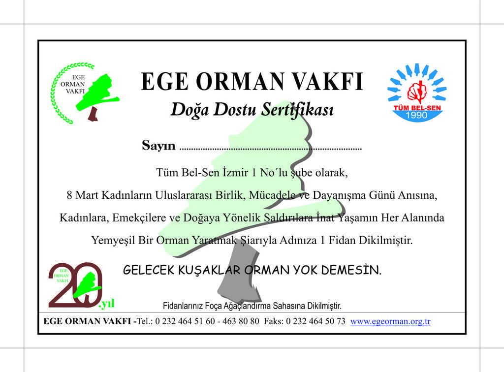 8 Mart kadınların uluslararası birlik, mücadele ve dayanışma günü nedeniyle, kadınlara, emekçilere ve doğaya yönelik saldırılara inat yaşamın her alanında yemyeşil bir orman yaratmak şiarıyla bütün kadın üyelerimiz adına birer fidan dikilecektir.