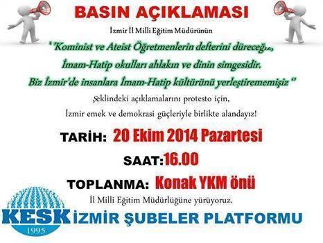İzmir İl Milli Eğitim Müdürü Vefa BARDAKÇI’nın “Komünist ve Ateist öğretmenlerin defterini düreceğiz,…İmam-Hatip Liseleri ve Ortaokulları ahlakın ve dinin simgesidir. …Biz İzmir’de insanlara İmam-Hatip kültürünü yerleştirememişiz…” şeklinde yapmış olduğu açıklamaları protesto etmek amacıyla 20/10/2014 Pazartesi günü saat:16:00’da Konak YKM önünde toplanılıp İl Milli Eğitim Müdürlüğü önüne yürünerek Emek ve Demokrasi Güçleri ile birlikte Basın Açıklaması yapılacaktır.