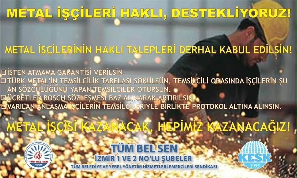 Metal işçileri sömürü koşullarına karşı RENAULT, TOFAŞ, MAKO, COŞKUNÖZ gibi fabrikalarda fiili olarak direnişe geçtiler.  Her türlü tehdit ve baskıya rağmen işçiler direnişlerinden vazgeçmiyor. Metal işçisi kardeşlerimizin direnişini direnişimiz olarak görüyoruz. Bu yüzden metal iş grevıne destek olmak amacıyla DİSK, KESK ve TMMOB'un cagrısıyla 21 Mayıs (yarın) 16.30'da eski Sümerbank önünde basın açıklaması yapılacaktır. Bütün emekçileri metal işçilerinin haklı direnişlerine sahip çıkmaya, katkı koymaya davet ediyoruz.