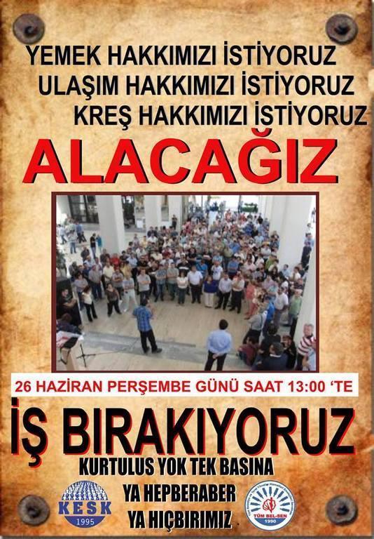 24 Haziran itibariyle Büyükşehir Belediyesi önünde sendikamız tarafından kurulacak masamızda TİS sürecine ilişkin başta üyelerimiz olmak üzere bütün çalışanlara sürece dair bilgilendirme yapılacaktır. Üyelerimizin başta talepleri olmak üzere sendikalarına sahip çıkmaya davet ediyoruz. Sendikamız tarafından aylardır çalışması sürdürülen TİS sürecine ilişkin Büyükşehir Belediyesi Yönetiminin tavrı nedeniyle tıkanıklık yaşanmaktadır. Büyükşehir Belediyesi Yönetiminin TİS masasında emekçilerin lehine hiçbir önerisi olmamakla birlikte mevcut haklarımıza göz dikmiştir. Ulaşım, yemek, kreş, emzirme odası vb temel haklarımıza ilişkin onlarca somut uygulamayı taraflarına iletmemize rağmen henüz bir adım atılmamıştır. Bu nedenle 26 Haziran Perşembe Günü saat 13:00 itibariyle başta ulaşım ve yemek olmak üzere bütün haklarımız için iş bırakarak İzmir Büyükşehir Belediyesi önünde toplanıyoruz. Başta üyelerimiz olmak üzere bütün kamu emekçilerini taleplerine sahip çıkmaya çağırıyoruz. Tüm Bel Sen İzmir 1 Nolu Şube yönetimi olarak emekçilerin bilgisi dışında herhangi bir metne imza atmayacağız. Sürece ilişkin yönetim kurulumuz ve web adresimiz dışında edinilen bilgilerin doğruluk payı bulunmamaktadır. başta üyelerimiz olmak üzere bütün kamu emekçilerin taleplerine sahip çıkmaya çağırıyoruz.