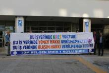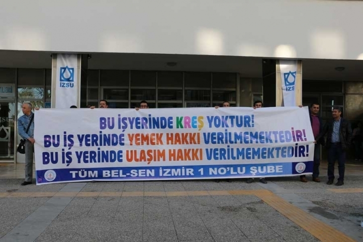 İzmir Büyükşehir Belediyesinde örgütlü KESK’e bağlı Tüm Bel-Sen İzmir 1 No’lu Şube, sözleşme yetkisini Birleşik Kamu-İş’e bağlı Tüm Yerel-Sen’den geri almak için üyelik çalışmalarına hız verdi. Sendika bir yandan da emekçilerin talepleri için mücadeleyi örgütlemeye başladı. Bu kapsamda bugün Büyükşehir Belediye, İZSU, İtfaiye, Halkapınar ek bina ve Belediye Oğuzlar binası önünde bir araya gelen Tüm Bel-Sen üyesi kamu emekçileri, “Bu işyerinde kreş yoktur. Bu işyerinde yemek hakkı verilmemektedir. Bu işyerinde ulaşım hakkı verilmemektedir” yazılı pankartlar astı.