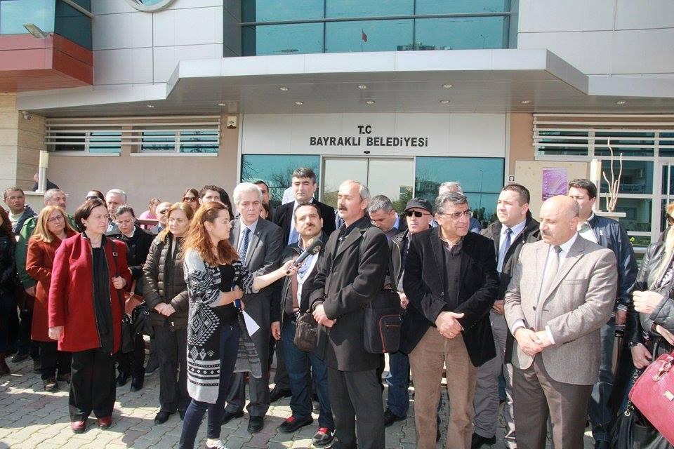 Bayraklı Belediyesi Kent Yenileme ve Kentsel Tasarım Müdürü,ÜYEMİZ İnşaat Mühendisi Ertuğrul ERSAN`ın, 6 Mart 2015 Cuma günü bir grubun fiziki saldırısına uğramasıyla ilgili olarak 12 Mart 2015 tarihinde Bayraklı Belediyesi Osmangazi Hizmet Binası önünde İnşaat Mühendisleri Odası(İMO) ile ortak yapılan basın açıklamasıyla üyemize yapılan saldırı kınandı.