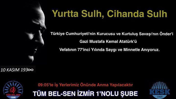 Türkiye Cumhuriyetinin kurucusu ulu önder Gazi Mustafa Kemal Atatürk'ün aramızdan ayrılışının 77.yılında saygı ve minnetle anıyoruz. 10 Kasım Salı günü saat 9:05'te işyerlerimiz önünde yapılacak anmalara bütün çalışma arkadaşlarımızın katılmasını rica ediyoruz.